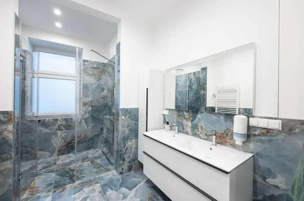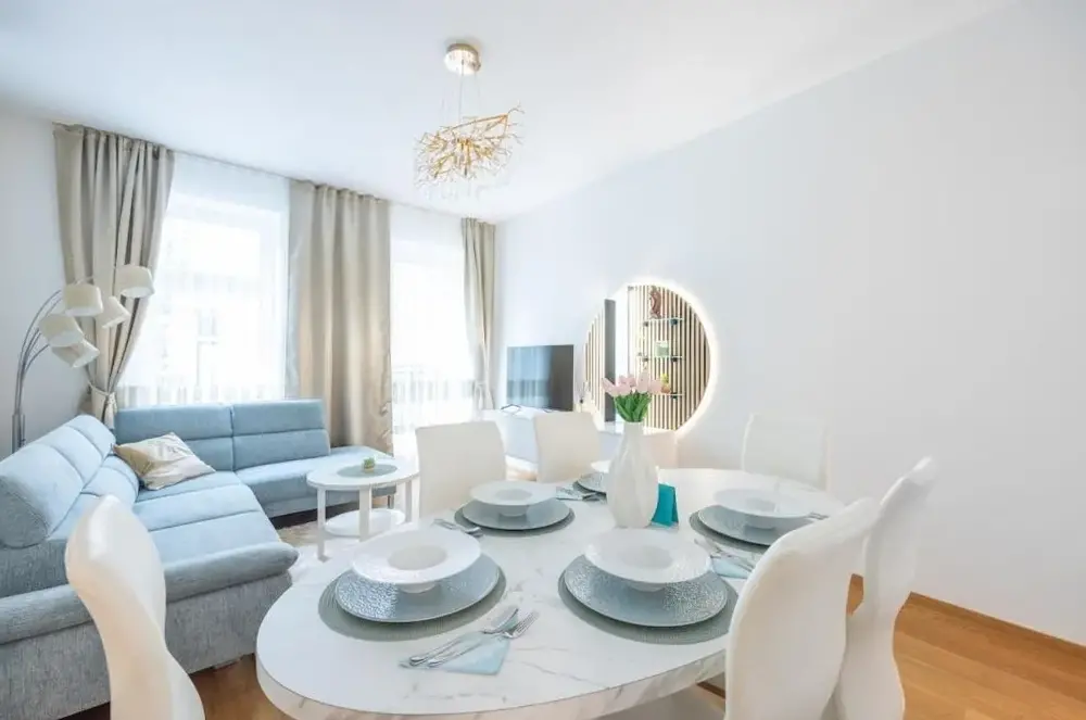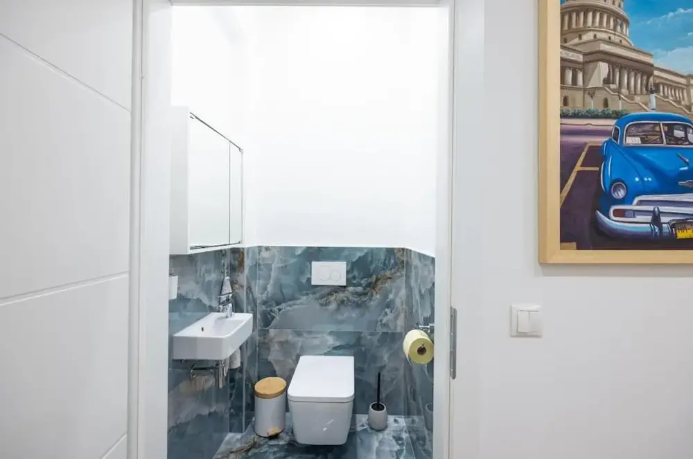 Stylishly decorated and renovated apartment with excellent location near the subway station. The nearest food restaurants in front of the house and take away 50 m away, a convenience store about 200 m. Quiet location because there is no street. Very large terrace in the courtyard. The apartment is comprehensively equipped with new kitchen utensils. Excellent coffee machine. In addition to the washing machine, the utility room had a dryer. Wifi worked well. Big TV in the living room (which was not watched).